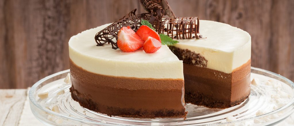 Juhlavassa suklaamoussekakussa on kolme eriväristä, mehevän suklaista kerrosta. Kakku tehdään valmiiksi juhlia edeltävänä päivänä, sillä sen annetaan hyytyä yön yli pakkasessa.