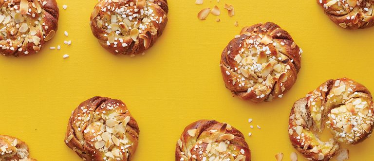 4. Voitele kanelikierteet munalla ja ripottele päälle raesokeria ja mantelilastuja. Paista uunin keskitasossa 225 asteessa noin 10–15 minuuttia.