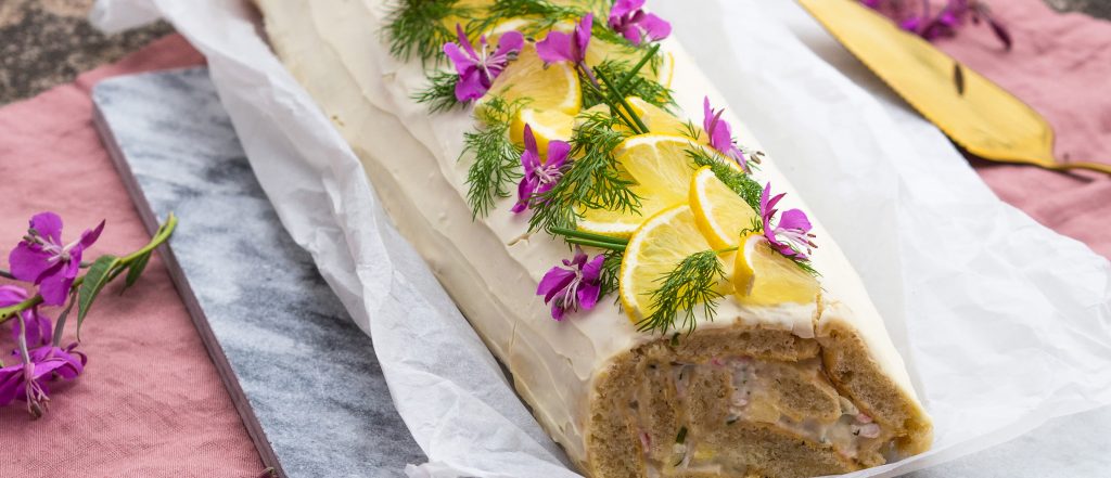 - Sekoita kuorrutteen tuorejuusto ja smetana tasaiseksi. Levitä kuorrute kääretortun päälle ja koristele esimerkiksi tuoreella tillillä, sitruunalohkoilla ja syötävillä kukilla.