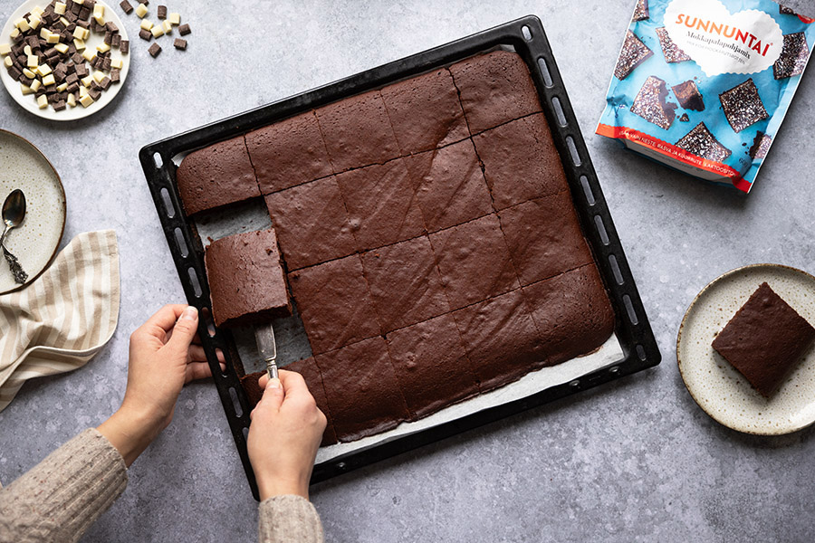 Oikaise leipomalla pohja Sunnuntai Mokkapalapohjamixistä pakkauksen ohjeen mukaisesti.