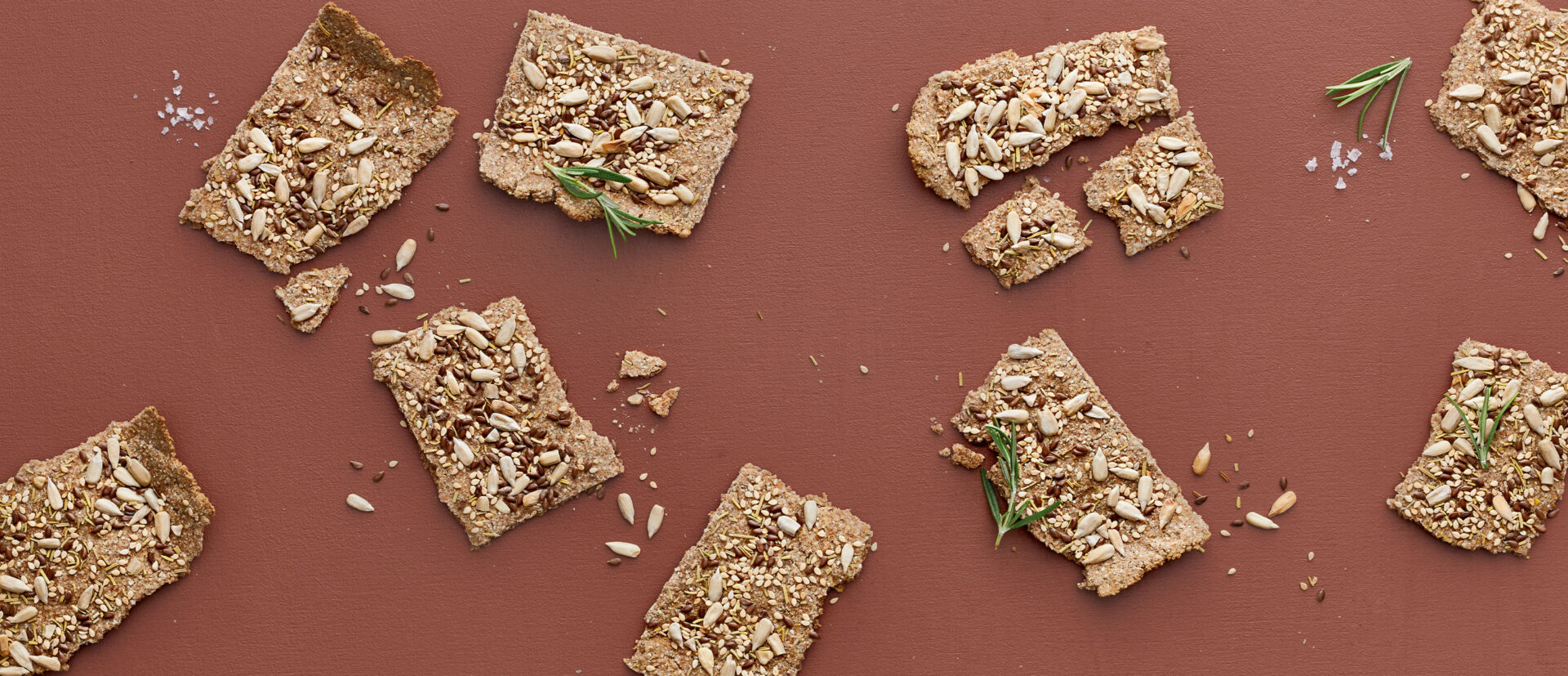 Rapea rosmariini-näkkileipä viimeistellään erilaisilla siemenillä. Siemennäkkileipä säilyy hyvänä ilmatiiviissä rasiassa.