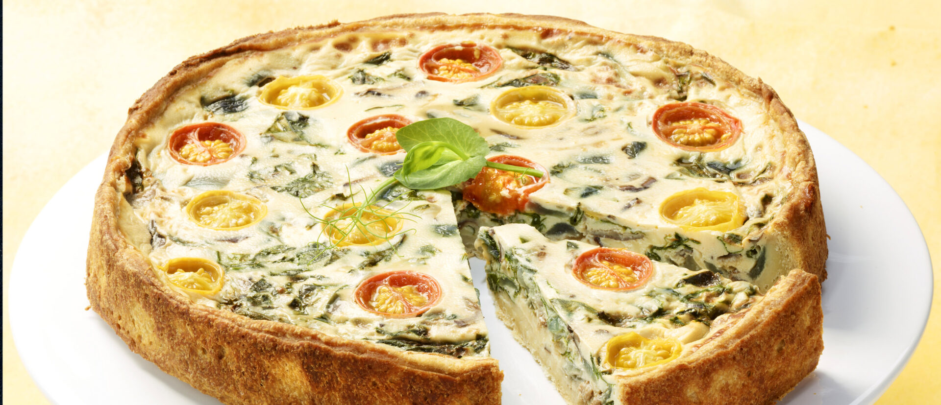 - Levitä sieni-sipuli-pinaattiseos taikinapohjalle. Kaada päälle kermamaito. Asettele kirsikkatomaatin puolikkaat piirakan pinnalle leikkuupinta ylöspäin.