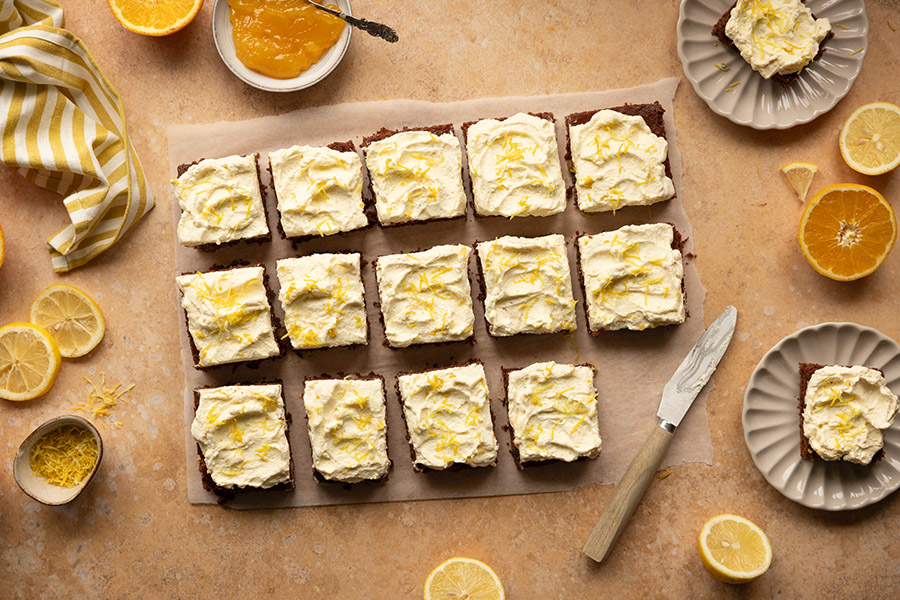 Ihanan raikkaat sitruksiset maut tasapainottavat näitä suklaisia mokkapaloja täydellisesti. Kuohkea vaahto kruunaa kokonaisuuden ja pohja valmistuu helposti Sunnuntain Mokkapalapohjamixistä!