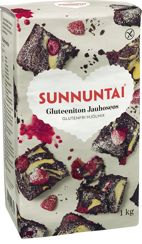 Sunnuntai Gluteeniton Jauhoseos sopii kaikenlaiseen leivontaan ja ruoanvalmistukseen, ja sen avulla valmistat herkut kätevästi gluteenittomana. Tuote on gluteeniton, laktoositon, maidoton ja kananmunaton.