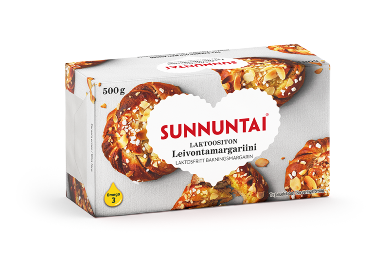 Kokonaan kasviperäinen Sunnuntai laktoositon leivontamargariini on maidoton ja laktoositon vaihtoehto leivontaan sopien näin moneen ruokavalioon.