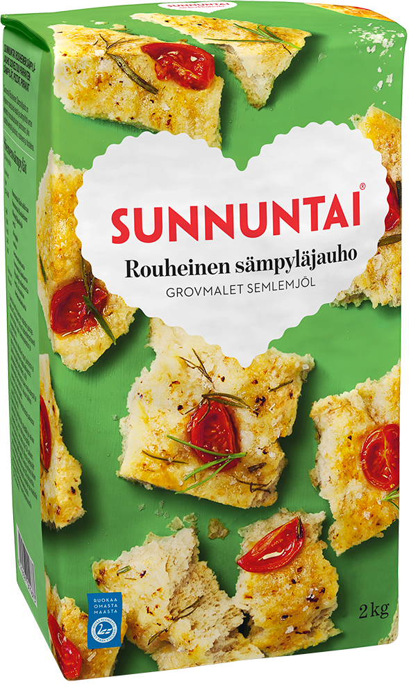 Sunnuntai Rouheinen Sämpyläjauho on viljaisen maistuvia leipiä ja sämpylöitä varten kehitetty runsaskuituinen jauhoseos, joka sisältää vehnää jauhoina, rouheena ja hiutaleina. Sämpyläjauhot antavat kuitua ja viljaista makua myös piirakka- ja pizzataikinoihin.
